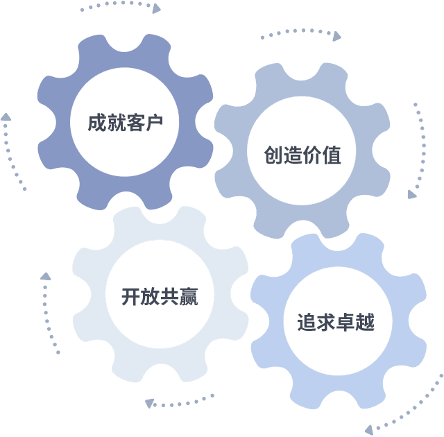成就客户是一切决策的出发点,,创造价值是衡量所有工作的标准,,追求卓越是我们做事做人的态度,,,,开放共赢是我们的格局也是最终的结果。。。。价值观的齿轮环环相扣,,推动着组织里的每个人不断向前。。。